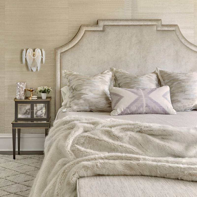 The glass wall lights’ canopies, lamp holders, and arms are accented with a rustproof electrophoretic brass finish, perking up the bedroom with a touch of shimmer. Crafted from impurity-free hand-blown glass, their opal glass shades distribute light evenly to avoid shadows. Their bow-knot-inspired design adds dramatic decorative impact and unbeatable character to the bedroom. With a lovely appearance, they provide a touch of whimsy and serve as the premier focus of the space. Their shiny finish is also suggested by the artwork and decoration on the nightstands and also blends perfectly with the tawny wood tone of the nightstands. The glass wall lamps, the multi-colored paintings, and the bright-colored pillows create a relaxing ambiance in the bedroom.