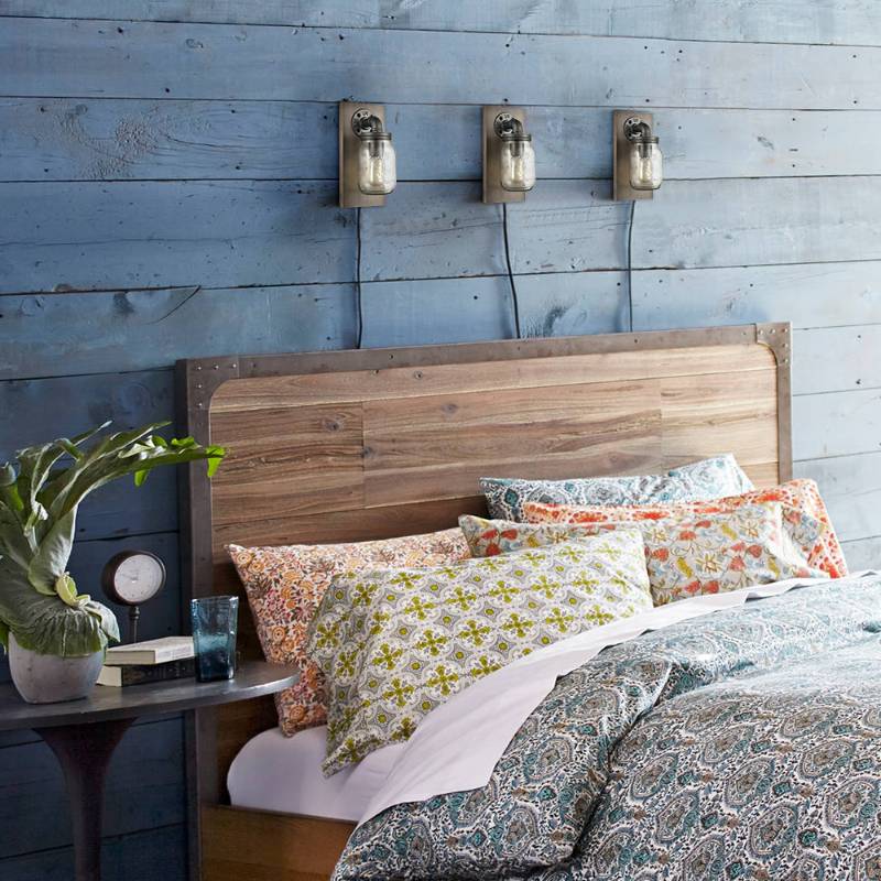 Being coated in a gunmetal black finish, three rustic glass wall sconces’ arms, lamp holders, the lids of mason jars, and the metal plates attached to the canopy provide a high-end rustic industrial look to the living space. Crated of impurity-free clear class, their mason jar glass shades are mounted to a solid pinewood backplate finished in distressing tortilla, conveying a touch of rough elegance to the fixtures. Their black finish establishes a mesmerizing contrast against the clear glass shade to create visual intrigue. The glass wall lights’ wooden backplates, the wood-clad walls, and the wooden headboard are completely in line with the rustic aesthetic of the bedroom. The wooden backplates’ distressing tortilla finish is well-suited to the wood tones of the headboard and the walls. The multi-colored pillows incorporate some colors into an otherwise neutral room.