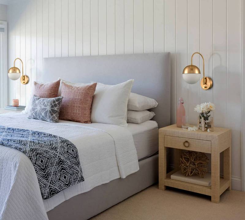 Flaunting an electrophoretic brass finish, the modern glass wall sconces show off the unique texture of double-layer electroplating and brushed metal. They spruce up the bedroom with a glint of glamour and make the living space fizz with a pop of personality. They double up on glass bell shades, creating layers of nuanced light. Their inner opal glass bell shade is encircled and protected by a bigger glass bell shade, boasting elegant geometry and adding a ton of eye appeal to the scene. They have all the style, charisma, and drama required to make everyone stand still to stare and appreciate. The modern glass wall sconces’ open double glass shades allow the light to shine through freely. The light fixtures pair nicely with the beige bedding, the beige wallpaper, and the tawny wood tone and blend seamlessly into this beige-dominated bedroom.