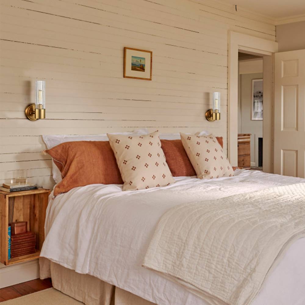 The modern wall sconce lighting’s lamp holder, bottom cover, and backplate sport a glossy electrophoretic brass finish, invigorating the living space with a boost of brightness. They are characterized by a cylinder glass shade crafted from impurity-free crackle glass with excellent light transmittance. Their fluted crackle glass shades are designed to encase an exposed bulb to complete the aesthetic. A lovely glow shines through the fluted glass shade, creating intriguing light effects and a dreamlike vibe. Their cylinder silhouette brings both stunning decorative detail and a touch of geometry. They play well off the tawny wood tone of the nightstands and the wood floor. The wall lights and the bedding in cider serve as glamorous centerpieces in the room.
