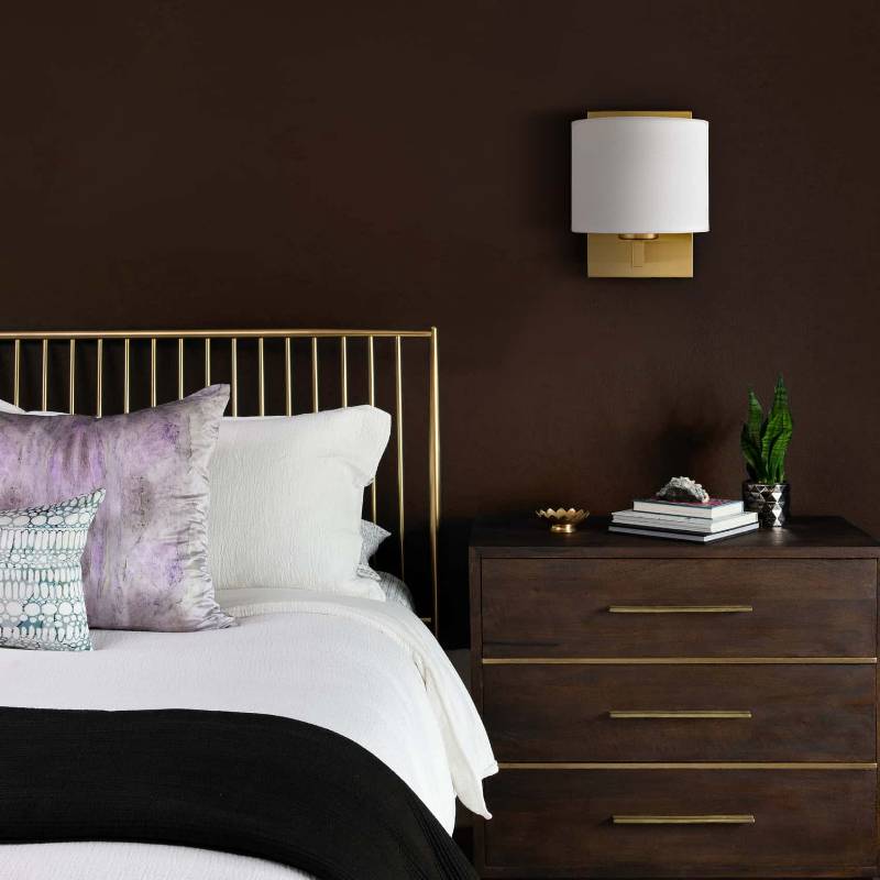 The modern wall lamp’s canopy, arm, and lamp holder are coated in a rustproof electrophoretic brass finish, invigorating the space with a boost of brightness. Boasting the covered edge workmanship, its beige linen cylinder lampshade completes the aesthetic with a large dose of texture. The rectangular canopy showcases the beauty of geometry and conveys a refined touch. The wall lamp’s gold finish offers the perfect contrast to beige cylinder lampshade and the black walls. The gold color is echoed in the drawer pulls, the decoration, and the headboard, carrying the color through the space. The light fixture and the bright-colored bedding keep the bedroom’s color palette from getting boring.