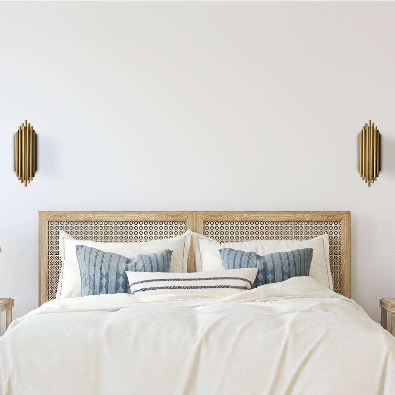 The mid-century modern wall sconces is crafted of stainless steel and boasts a glittering electrophoretic brass finish, showing off the unique texture of brushed metal. Sporting an impressive design, the stainless steel rods at mixed lengths make a radiant statement in the room. Their stainless steel rods encircle two exposed bulbs in the middle, rounding out the design with a mid-century modern vibe. With the gleaming accent of the stainless steel rods, it creates a stunning light effect and a pleasant ambiance. They are strategically placed on either side of the bed, providing soft and even lighting for reading or other activities and enhancing the overall functionality of the bedroom. Their gold finish works well with the tortilla color of the headboard and the nightstands. The modern wall sconces and the blue pillows add zest to the otherwise neutral palette of the bedroom.