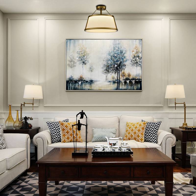 The led industrial ceiling light’s canopy, lamp holder, frame, arms, and hanging rod sport a rustproof electrophoretic brass finish, pepping up your living space with a bit of bling. Its linen drum shade is held aloft by the three-pronged metal frame and three arms attached to the canopy for bringing rich visual interest to the living room. The light pouring through the linen drum shade is gently muted and fills the room without any glare. The led industrial ceiling light’s trapezoid drum shade gives the space a touch of geometry. By adjusting the color temperature of the light, the way that the paints and textile colors appear will be different. The table lamps pick up on the colors of the ceiling light for a cohesive look. The led industrial ceiling light’s brass finish is a perfect fit for the walnut brown table, the patterned mustard yellow cushions, and the dijon yellow vases.