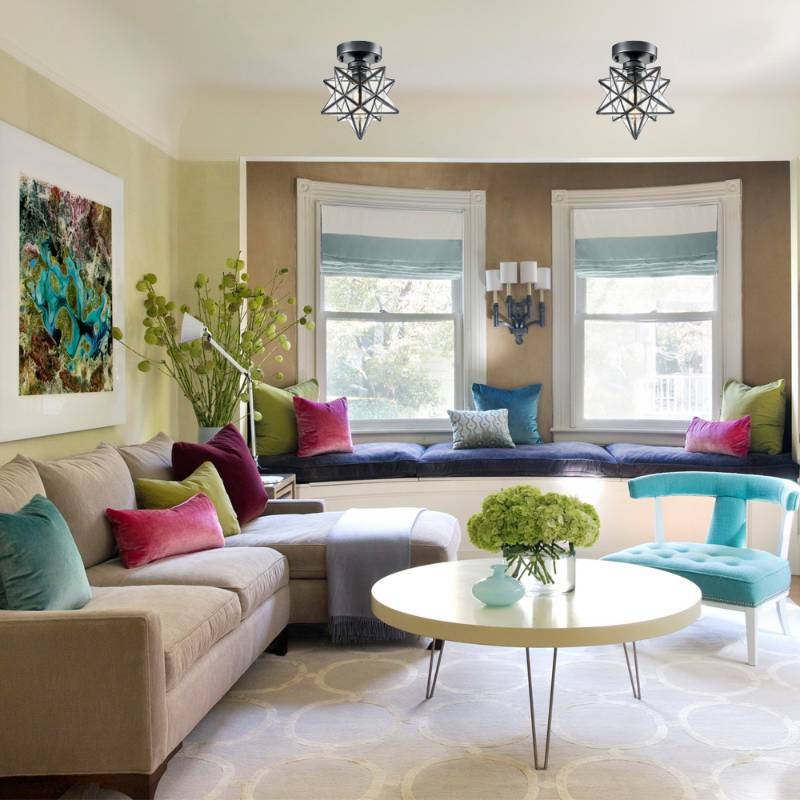 Crafted of impurity-free clear glass, the Moravian star glass shades of the industrial ceiling light fixtures are exquisitely hand-welded and pair nicely with the black edges featuring copper alloy covering. Sporting a rustproof semigloss black finish, they give the living room a dash of modern sophistication. The industrial ceiling light fixtures’ stellated multi-point design adds an element of surprise and whimsy to the living space. The glass shades contrast the black finish and add alluring visual interest to the room. Their celestial-inspired design makes them instant conversation pieces that catch everyone’s eyes. Their dark finish contrasts the white ceiling and is echoed in the wall sconce. They add a punch and luxe texture to the living room together with the bright-colored cushions and the turquoise sofa.