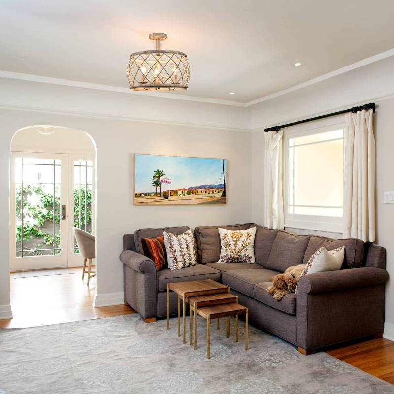 7. The Drum Ceiling Light Keeps the Living Room Feel Open and Airy