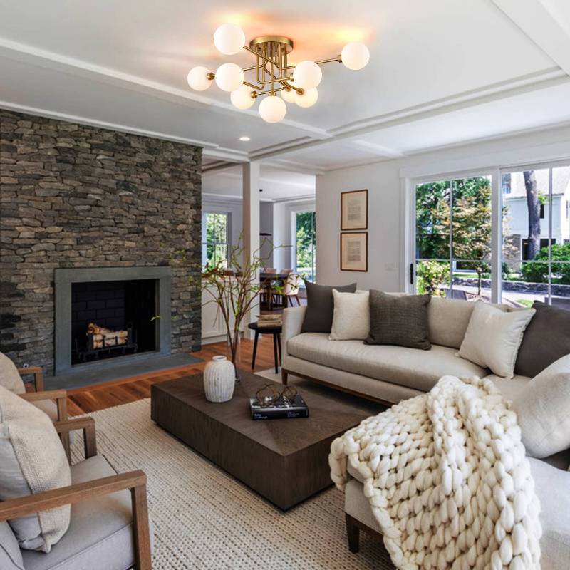 The modern industrial ceiling light’s canopy, arms, and lamp holders are dressed in an electrophoretic gold finish, bringing a dash of metallic glitz to your living space. Crafted from impurity-free hand-blown opaque opal glass, the industrial-style ceiling light provides the perfect blend of mid-century classic and contemporary elements. Nine glass shades are supported by gracefully curved arms that intersect and extend outward in every direction. Its opal glass shades contrast and compete with the gold finish, adding a ton of eye appeal and enhancing the piece's visual interest and beauty even further. Showcasing a sputnik design, it allows the light to gently filter through the opal glass shades and cast intricate shadows. Its brass finish and opal glass shades are well-suited to the tawny wooden furniture, the caramel wooden floor, the white wall, and the throws.