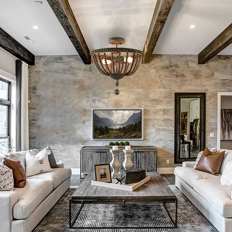 The industrial wood beaded ceiling light boasts a bunch of distressed gray wood bead garlands draping down from the frame to form an airy bowl shade. The laidback beaded curtain encircles two bulbs while the lamp-holders and arms showcase a unique two-way swirl design. Its beaded rim and the dangling wood bead bottom accent complete the look and lend a boho-chic style to the space. The wood beads bring a dash of drama to the opulent silhouette of the luminary. Pairing with metal, the wood beads make for a stunning play on materials. Its wood accent gives the living room an organic vibe and enhances the room’s farmhouse appeal. The wood accent repeats on the floor, the table, the beams, and the cabinet. It provides an instant uplift to a living room that is immersed in a neutral color palette.