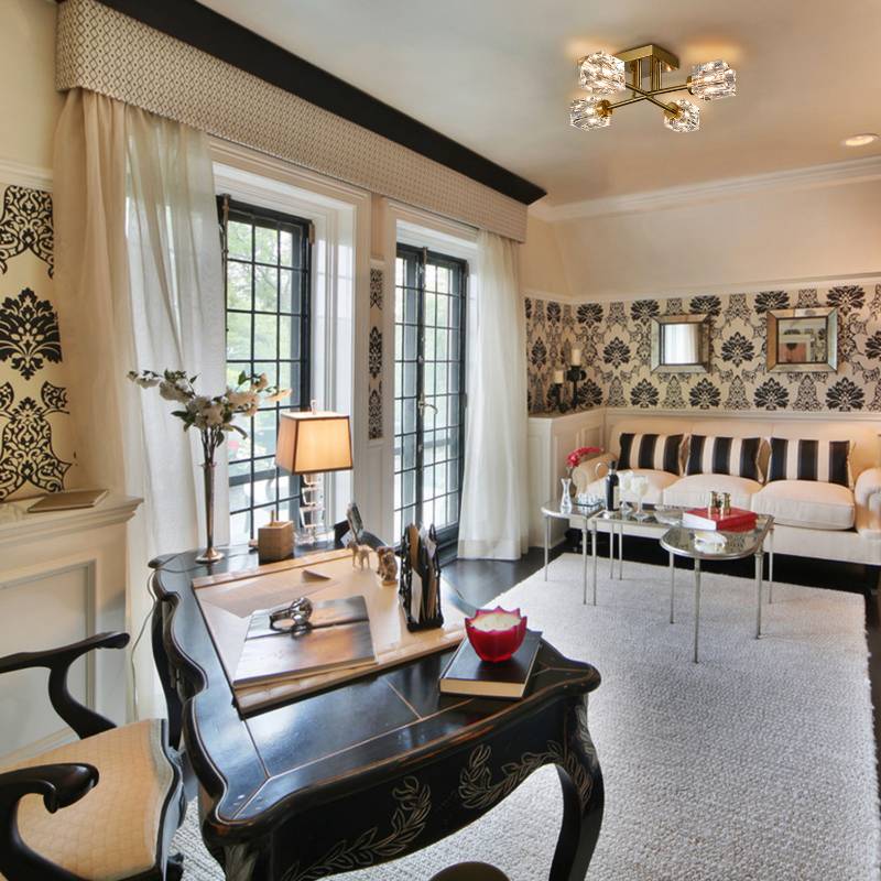 Showing off a rustproof electrophoretic gold finish, the modern industrial ceiling light delivers a dramatic decorative impact and makes the living room fizz with a pop of personality. Its four intersecting arms spread light in all directions and each arm carries a crystal glass shade at the end. The square crystal glass shades largely resemble the glittering ice cubes and showcase the beauty of geometry. The sputnik-inspired design brings a modern edge to this modern industrial ceiling light. This fashionable fixture boasts a stunning starburst silhouette, providing depth, dimension, and a dash of drama to the room. It stands out and shines on its own with its glossy gold finish and crystal accent. It adds texture to the space and keeps a black-and-white color palette from getting boring.