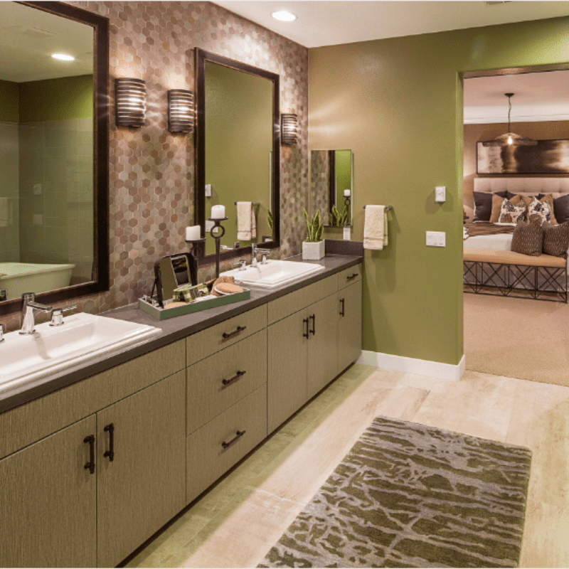 Three bathroom wall sconces boast a dark brown finish that peps up the bathroom with a dash of drama. Their semicircular cages bring geometric elegance and an unrivaled level of sophistication. The metal cages encircle the exposed bulbs and make a statement without overpowering the room. Their metal cage design allows the light to gently filter through and cast intricate shadows. The light fixtures bring out tones from the mirror frames, the countertops, and cabinet pulls. The olive carpet and olive walls and plants add a wonderful pop of color to the bathroom and help this bathroom achieve an organic aesthetic. The brown-colored decors together with the olive decors evoke a sense of serenity and tranquility, transforming a simple bathroom into a calming retreat.