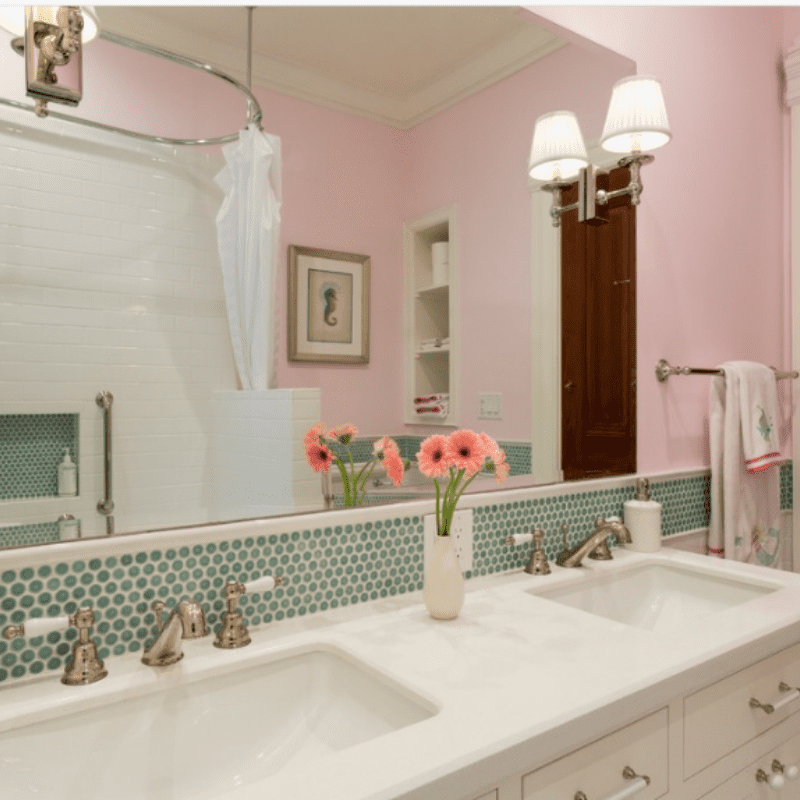 The mirror in the bathroom is adorned with a wall sconce sporting a fabric drum shade. The wall light captures attention with its beige pleated lampshade. The wall sconce adds all kinds of character to the space and a bit of bling with its brushed nickel finish. The light pouring through the fabric lampshade is gently muted and fills the space without any glare. Its drum shade accent, the brushed nickel finish, and the beige color are voiced by the pendant light above the vanity and the beige vanity. The faucets, the pulls of drawers, and other bathroom ware in brushed nickel are matched by the bathroom wall sconce. The wall light, pink walls, flowers, and green tiles usher in a feminine touch to the room.