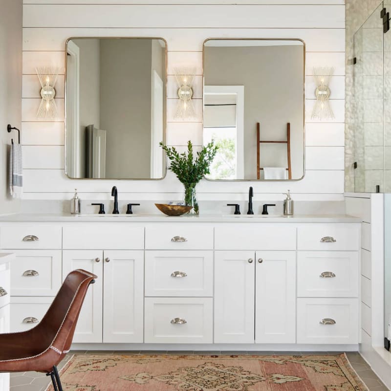 Brimming with a mid-century style, three modern bathroom sconces are accented with a matte beige finish with a gold tinge, giving the space a touch of whimsy. A myriad of metal rods extending upward and downward constitute an eye-catching starburst pattern and encircle two exposed bulbs in the middle. Their celestial-inspired design adds an element of surprise and character to the bathroom. They serve as nice works of art that decorate the blank wall and are attention-grabbing additions to the space. Their beige finish coordinates with the white cabinets and the white walls. The bathroom wall lights’ wow-worthy design pops against the all-white bathroom alongside the cinnamon chairs and the carpet featuring exotic patterns.