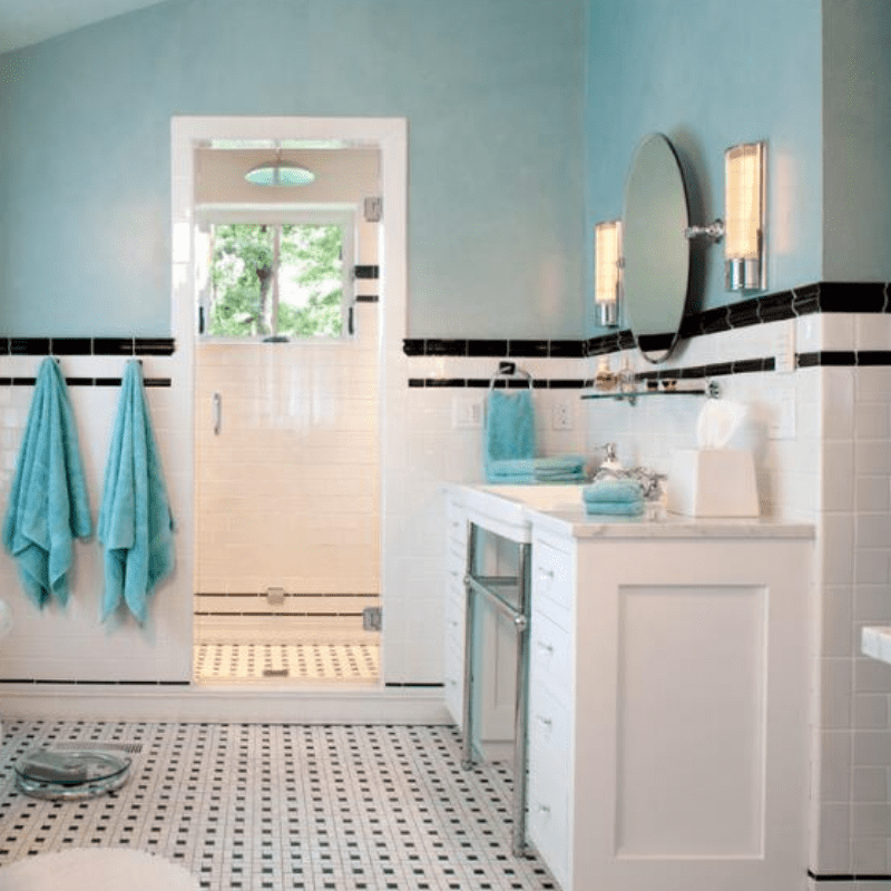 Flaunting a polished chrome finish, a pair of glass wall sconces flank the mirror and spice up the bathroom with a bit of bling. Their elongated cylinder shades are designed to house a bulb to complete the aesthetic. Their cylinder glass shades add depth and dimension to the fixture. A lovely glow shines through the cylinder shades, which enhances the inviting nature of a coastal bathroom. Their chrome finish is echoed in bathroom ware and the faucets. The clear glass design of the bathroom vanity sconces allows them to blend seamlessly into the space. The light teal walls and the turquoise towels show off the coastal hues that look great in a crisp white bathroom. A splash of colors serves as a refreshing sight and makes the bathroom come alive.