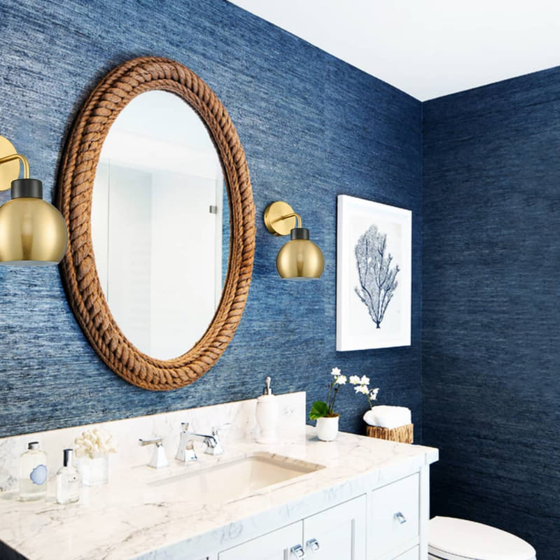 The mid-century bathroom wall lights’ canopies, delicately curved arms, and globe shades are dressed in a glossy electrophoretic gold finish, livening up the bathroom with glitzy sparkle. Their lamp holders provide dramatic decorative impact with a semigloss black finish. The white interior of the lampshades helps reflect the light. Showing off a sleek sphere silhouette, the bathroom vanity sconces showcase the beauty of geometry and complete the aesthetic with an elegant touch. Their gold finish complements the hemp rope mirror frame, the ribbon blue walls, and the navy blue hue in the painting. These bathroom decors showcase the natural tones of sand and sea and bring warmth and glamour to the space. The globe shades of the light fixtures diffuse the light, creating a soft, warm glow that is perfect for a beachy bathroom.