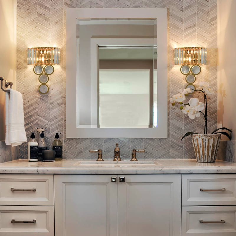 The vanity sconces sport a stainless gold finish, bringing a dash of metallic glitz to the space. Dazzling beveled crystal prisms on the wall sconces are arranged in a semicircular pattern, which conceals the bulbs and draws the eye upward to a beautiful display of crystal and metal. Their semicircular lampshades are attached to a metal frame consisting of four conjoining circles. They provide extra sparkle and a touch of luxury to the bathroom with the rounded faceted crystal pendants dangling in the middle of each conjoining circle. Their crystal accent makes these brass wall sconces dazzling eye candy that catches everyone’s eyes and enhances the pieces’ visual depth and beauty even further. Arrays of hanging crystal prisms illuminate the room with refracted light. The flower pot and the bathroom hardware pick up on the colors of the crystal wall lights, which adds a touch of warmth to this white bathroom.