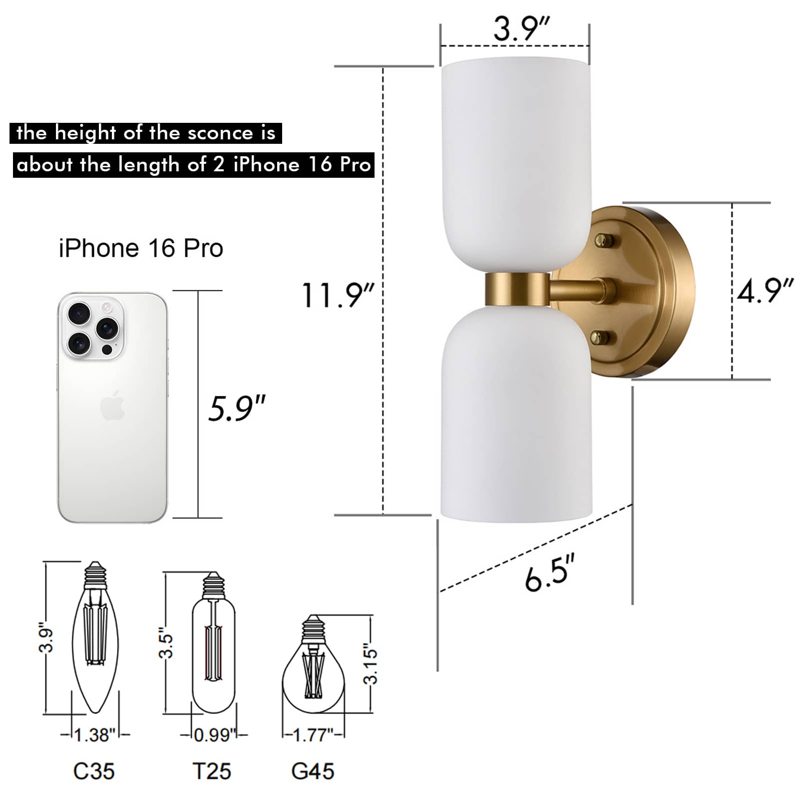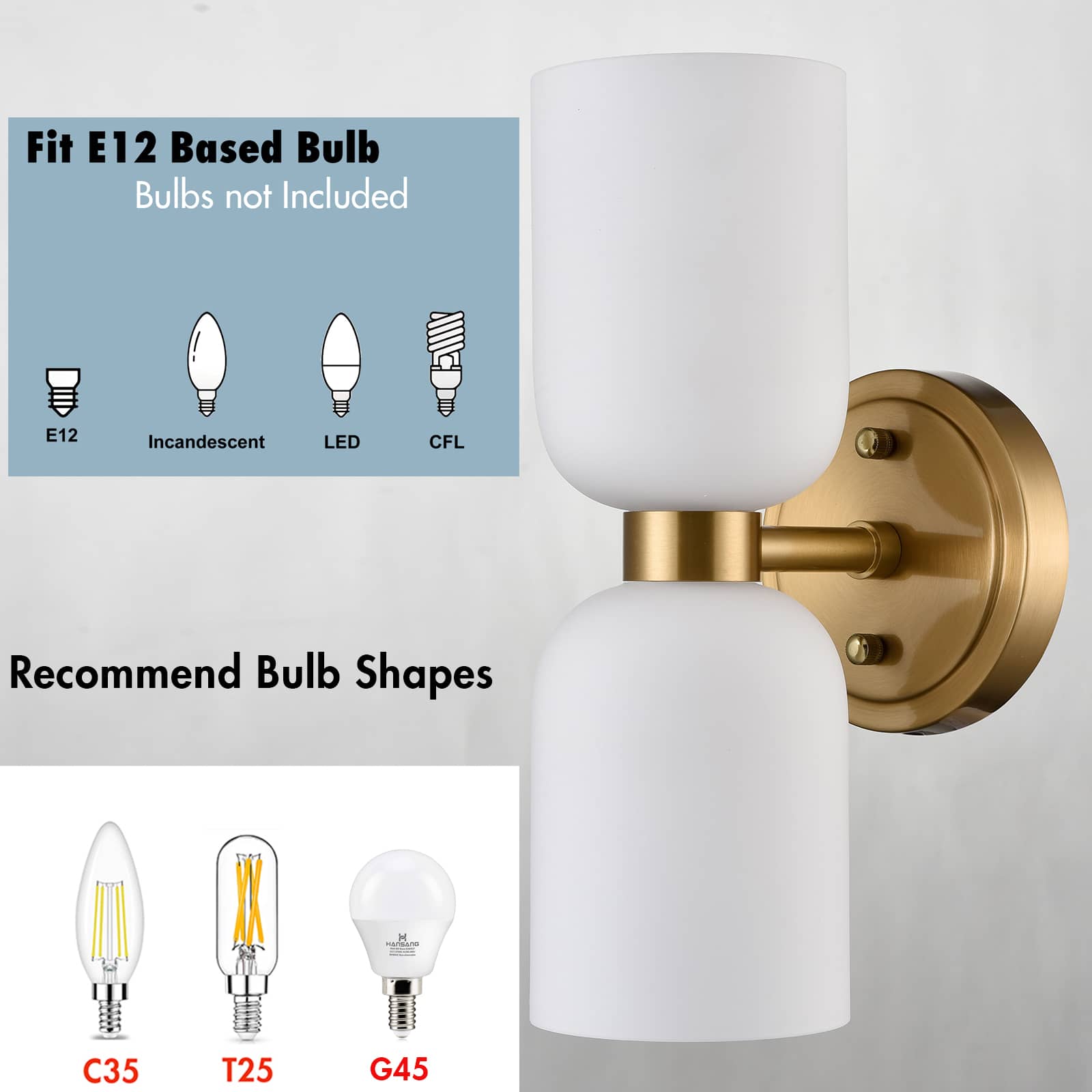 Each wall sconce comes with two E12-base sockets which are compatible with a variety of bulb types: LED, INCANDESCENT, CFL.
