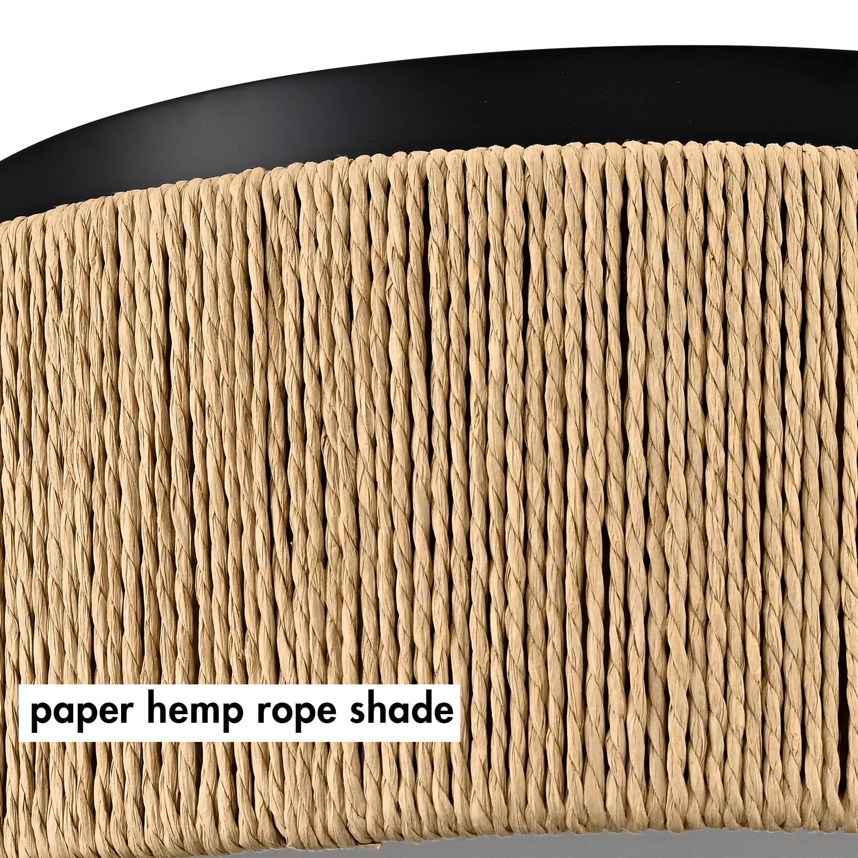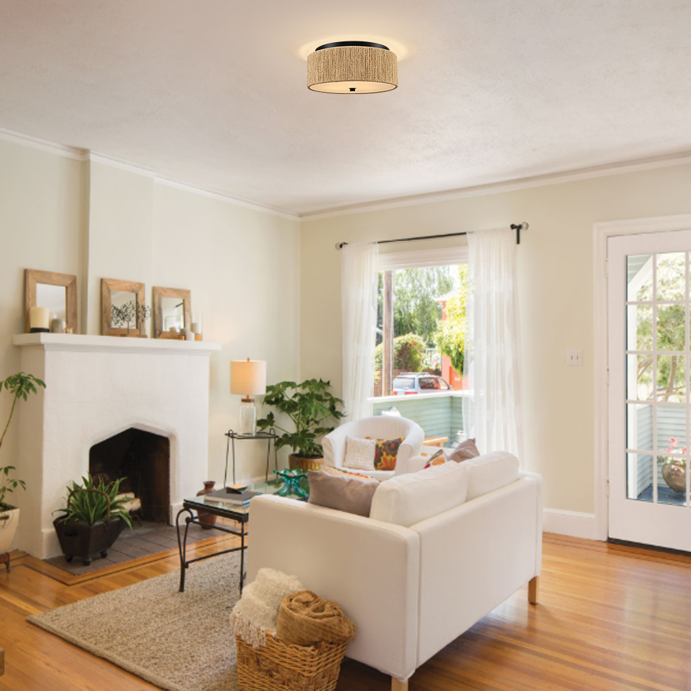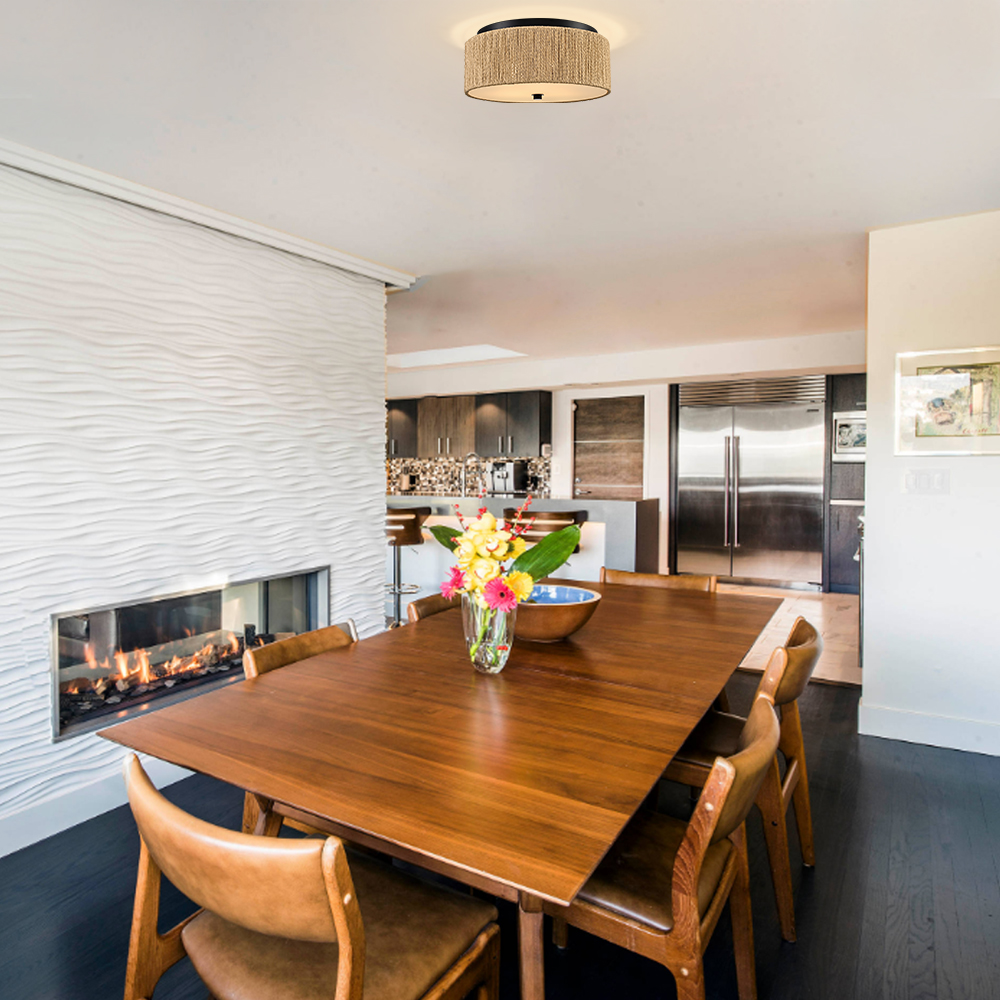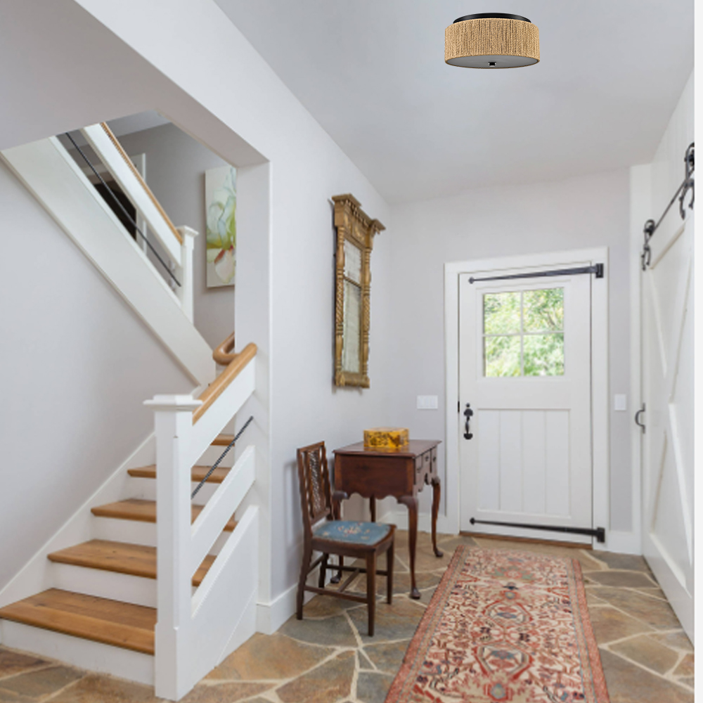 The flush mount ceiling light's canopy and bottom nut boast a rustproof black finish, lending a touch of modern elegance to your interior. The drum shade flaunts a number of brown paper hemp ropes finely twisted and wrapped around the drum shade, bringing a feeling of relaxed coastal charm and delivering a large dose of texture to the space. It offers a surprising twist and supplies a dash of drama without overpowering the rest of the space. A charming glow shines through the tempered frosted glass diffuser, filling the space without any glare. Its black finish contrasts the brown paper hemp ropes and adds alluring visual interest to the interior.