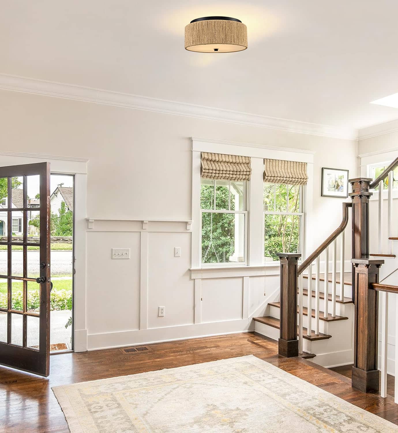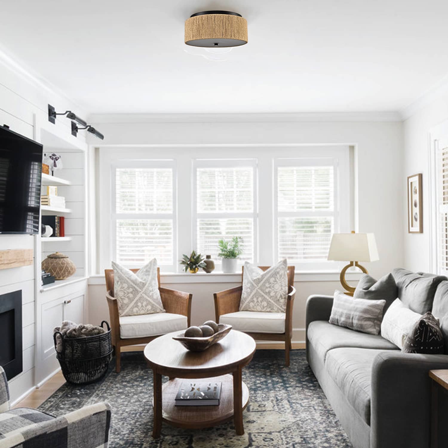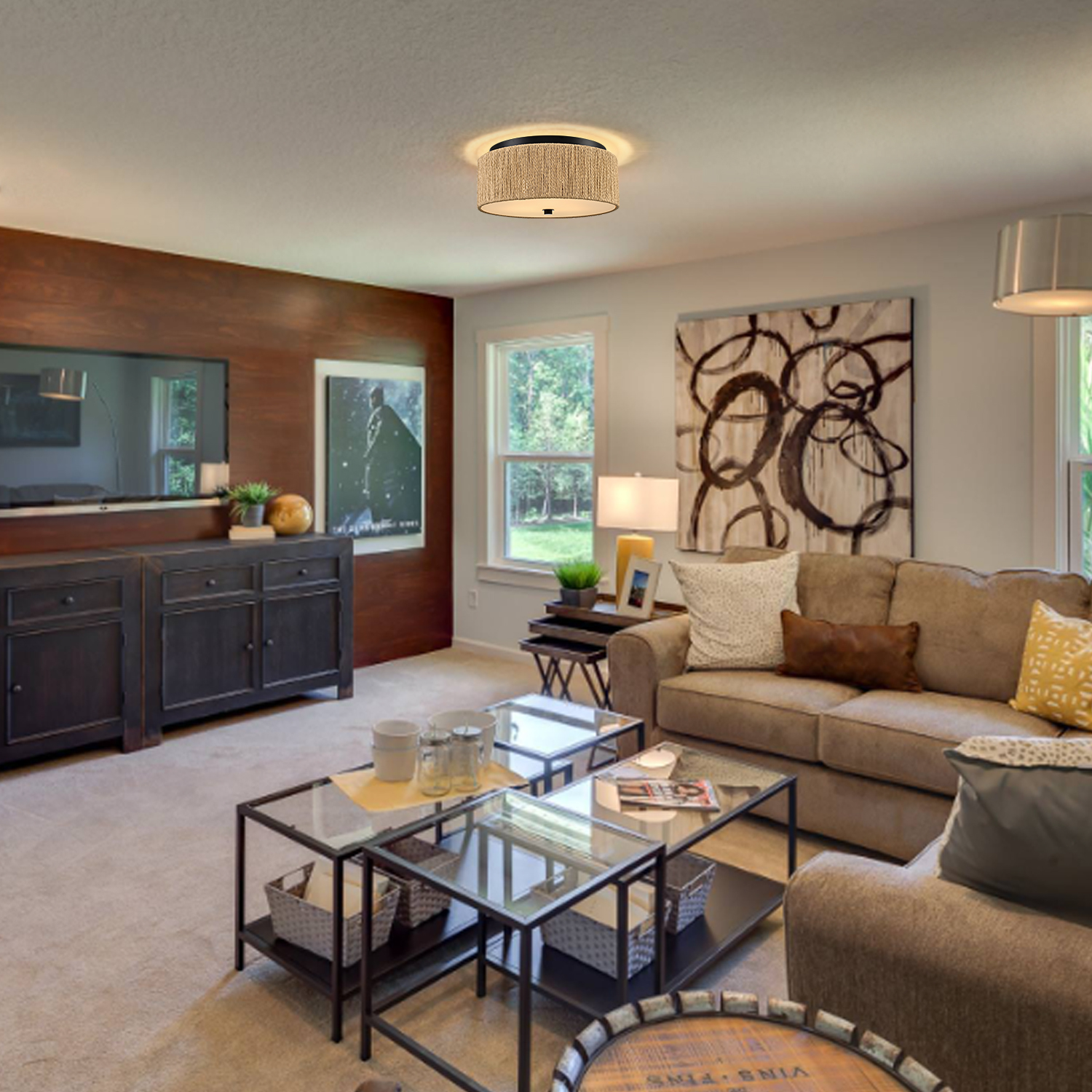 The flush mount ceiling light's canopy and bottom nut boast a rustproof black finish, lending a touch of modern elegance to your interior. The drum shade flaunts a number of brown paper hemp ropes finely twisted and wrapped around the drum shade, bringing a feeling of relaxed coastal charm and delivering a large dose of texture to the space. It offers a surprising twist and supplies a dash of drama without overpowering the rest of the space. A charming glow shines through the tempered frosted glass diffuser, filling the space without any glare. Its black finish contrasts the brown paper hemp ropes and adds alluring visual interest to the interior.