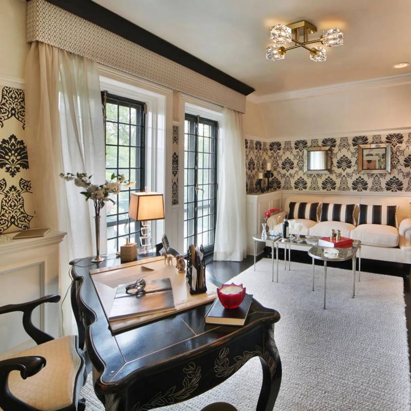 The modern crystal ceiling light's frame, arms, and canopy sport an electrophoretic brass finish, highlighting the living room with a glitzy sparkle. Six clear crystal glass shades provide attractive eye appeal to the space and stand out and shine on their own. The crystal glass shades are attached to two wavy bars and largely resemble the glittering ice cubes. With exquisite workmanship, six shades are evenly aligned in a linear formation when viewed from different angles. Its shimmery brass finish contrasts the crystal glass shades and adds alluring visual interest to the space. It catches the light to create a beautiful, dazzling effect as well as provide generous ambient illumination. The modern crystal ceiling light, the bright-colored sofas, and the bright-colored cushions introduce surprising pops of color and add excitement to this otherwise boring space.