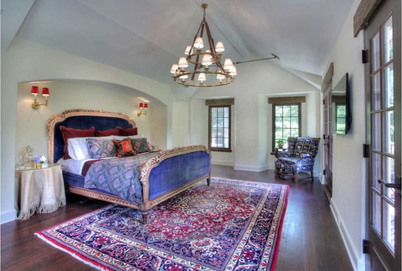 The wood chandelier's farmhouse frame and candelabra-inspired lights infuse an old-world style into this bedroom. Its scrolling arms, candle cups, candlesticks, and the column in distressed brown bring sculpted details and country style. The crafted wooden pendants draping on top lend a cottage chic and add eye appeal. The luminary, the mocha brown wall, the tawny wood floor, and the medallion table lamp play up the brown tone. The refined accessories such as light-colored bedding and area rug lift the style to an even higher level of sophistication.