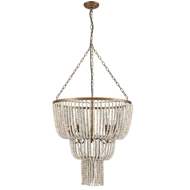It’s rounded silhouette with white wooden beads gives your interior a breezy but laid-back feel. The shade also consists of rustic gold wood beads that drape from its metal frame and five candelabra-inspired lights.