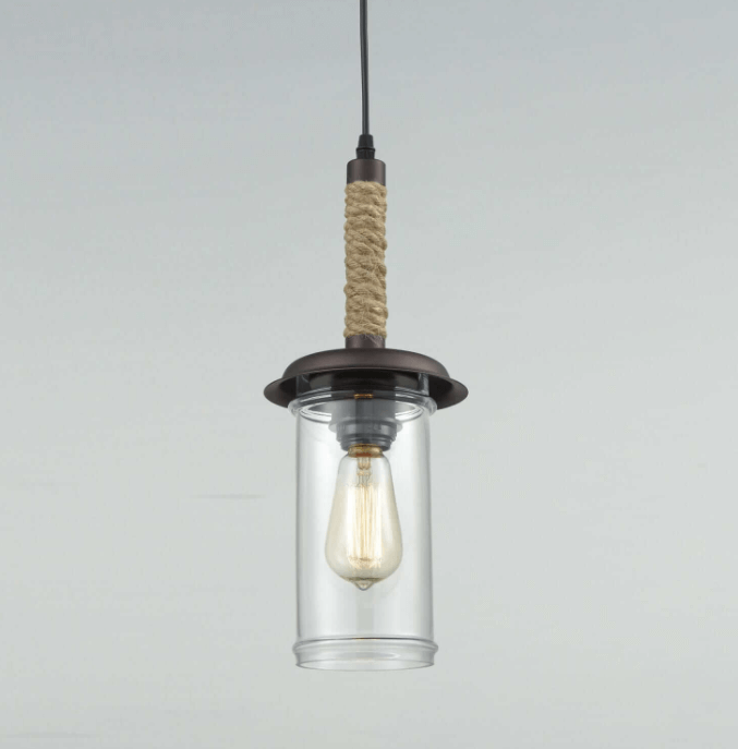 This pendant light has both a rustic charm and chic vibe. While the oil rubbed bronze finish and rope wrapped rod gives this light fixture a farmhouse effect, the sleek cylinder shaped clear glass shade adds a touch of sophistication.