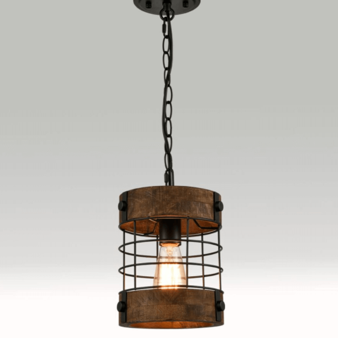 Bring home some farmhouse charm with this eye-catching industrial pendant light. With its semi-gloss black finished cage and wood bands finished in dressed brown, this fixture surely is one of the best industrial pendant lights for your kitchen, foyer, hallway, or bar.