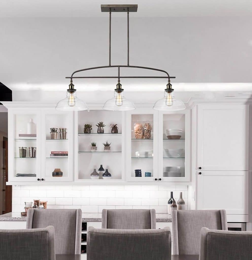 Constructed of hand-blown glass, the industrial brass island pendant lights add an extra glint of glamour to your space. The bell shade and the shiny finish make for a focal point and send out an industrial-inspired touch in your workspace, living room, and you name them all.