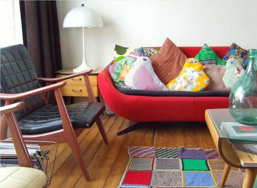 Being fashioned from acrylic, the white table lamp enhances the playful touch of the eclectic living room. Boasting a semicircular lampshade, the light fixture generates an understated look in the space. Its rounded shade serves as a light reflector and creates a charming light effect. Its solid stem and base keep the lamp standing on the table stably. With a muted color, it stands out against the orange-brown table while partnering perfectly with the white walls. The lamp, the wood furniture, and the wood floor in orange-brown keep the bold colors of cushions, containers, and the area rug in check, so that the living room doesn't appear too loud.