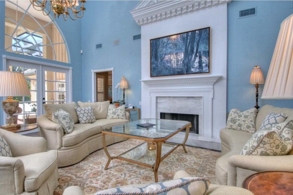 A dual of table lamps flanking the fireplace add a pop of elegant style to the living room with their cone shades and sculptural stems. Sporting a pleated accent, their fabric cone shades in beige send out a refined touch to the space. Another pair of table lamps are placed on the tables beside the taupe sofas. Their fabric drum shades repeat the pleated accent of the lamps flanking the fireplace. The floral pattern on their exquisitely glazed ceramic bodies is voiced by the area rug and the gray-and-white cushions. The baby blue walls, the blue accent in the artwork, and the blue-and-white furnishings make for a visually soothing ambiance for a happy gathering.