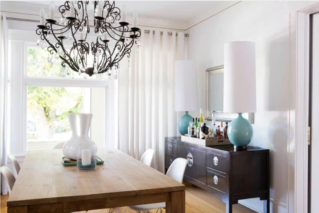 A duo of table lamps being placed on the cabinet easily steal the show with their white fabric lampshades. Their elongated cylinder lampshades add a touch of whimsy and a bold decorative detail to the dining room. The white lamp shades go well with crystal chandelier’s beige candlesticks, the white wall, the white drapes, and other white furnishings. Their teacup teal ceramic stems bring just the right amount of intense color to the room along with other containers in the same color. Serving as task lights, they emanate subtle light rays for dinner time. These luminaires contrast the tortilla dining table, tortilla wood floor, and the chocolate cabinet and bring an interesting touch to the room.