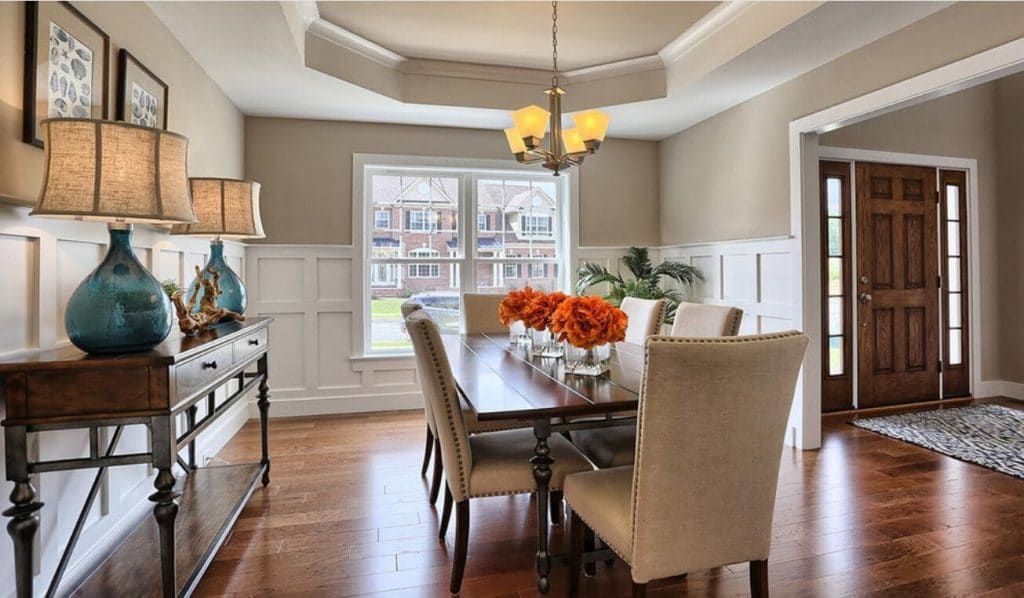 The table lamps on the console table beside the wall emit a gentle glow to complement the four-light chandelier. They can also highlight the features of the artworks on the wall. Being fitted with linen fabric shades, they add a hint of rusticity to the room. The latte fabric shades blend perfectly with latte upholstery of the chairs, the walnut table, the dandelion cone shades of the chandelier, and the gingerbread wood floor. These luminaires capture the eye of all visitors with their bright-colored bodies. Their rounded cerulean stems add a vibrant twist and offer an organic aesthetic to the interior along with the red flowers and the green plants.