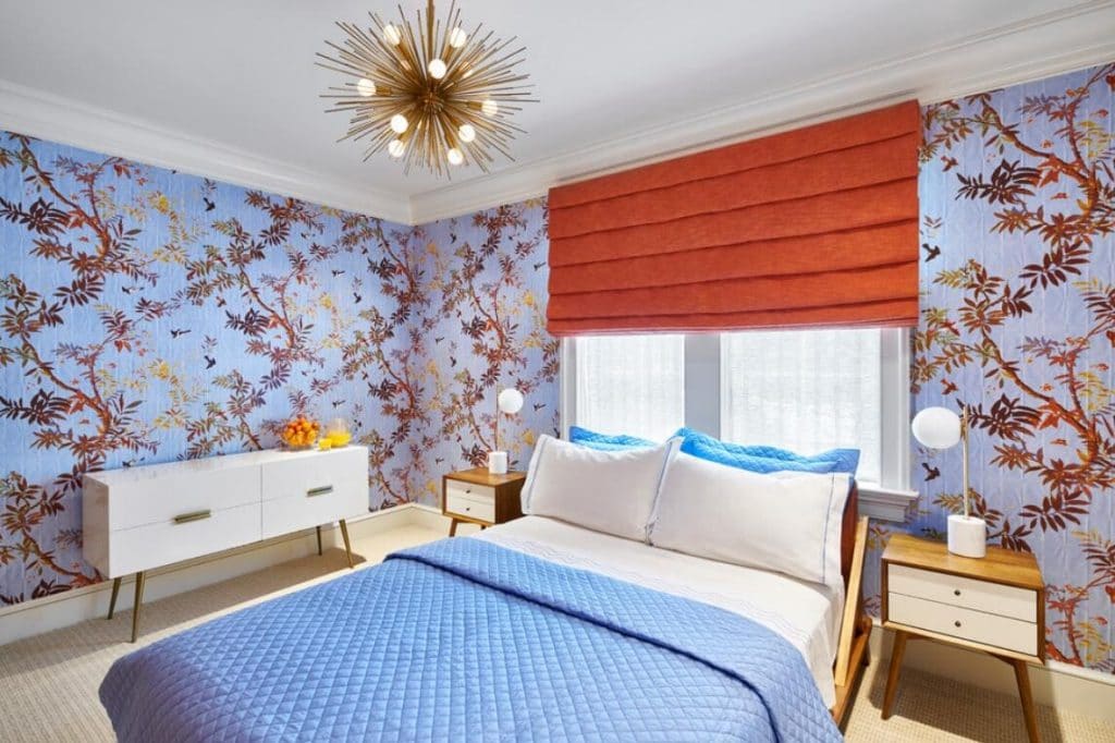 A pair of table lamps standing on the nightstands flanking the bed provide soft light rays for your bedtime reading. They consist of cylinder white bases crafted of resin and oval opal glass shades supported by brass arms. Their lovely appearance provides a surprising twist and dramatic decorative impact to the room. The white table lamps’ rounded accent appears in the bulbs of the sputnik chandelier. Its brass finish works beautifully with the botanical pattern of the wallpaper, the chandelier, and the tortilla wooden furniture. The turquoise blue bedding, the sky blue background of the wallpapers, and the orange shades give the space a feeling of relaxed beach style that makes the room a great retreat to unwind.