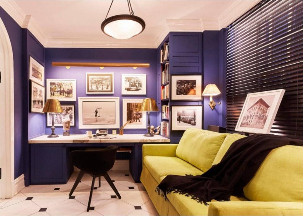 A pair of lamps shine in this mini home office with their shimmery color. The light cast through their cone shades is gently muted, which reduces glare and eliminates harsh shadows. The brass finish of their cone shades is also carried by the wall light. Their cone shades and the wall light’s trapezoidal shade play with geometry and shapes and add a touch of modernity to the space. Being finished in bronze, the table lamp stems coordinate with pendant light, the chair, and the blinds. The corn yellow sofa, the mauve walls, and the light fixtures bring intense colors to the home office and lift the palette to a higher level of sophistication.