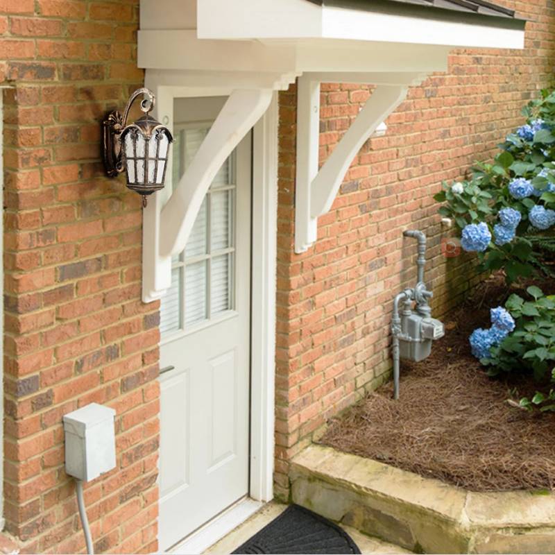 Flaunting an antique gold finish with a black tinge, a pair of rustic outdoor wall sconces infuse a touch of glitz and convey a hint of rusticity to the entrance. An awesome glow shines through their opaque conic contour-baked glass panels, setting a mood for the entrance. The light fixture’s impurity-free hand-blown glass panels are encased by the framing sculpted details and the delicately curving arms, giving an instant uplift to the aesthetic. Constructed of solid aluminum and glass, these warm-toned lights create a cozy and inviting atmosphere. Their scrolling arms and antique finish add undying glamour to the space. Their glittering finish sets them apart from the glass panels and showcases a higher level of sophistication. Their gold finish is the perfect complement to orange tiles and the wall lights and the tiles make the entrance shine.
