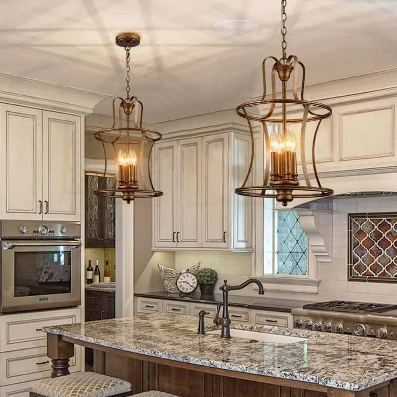 The farmhouse pendant lighting fixtures deliver a dash of sparkle and shine to your interior with a rusty antique gold finish. Crafted of solid metal, their open cage shades are adorned by four arched metal bars. Its hourglass-inspired design adds visual interest and character to the kitchen. Their open cages surround four candelabra-inspired lights standing upright in the middle. The cages are also topped with four curved arms, generating a dramatic look that will impress. With the open design, the farmhouse pendant lighting fixtures spread light evenly and create intriguing light effects and shades. They serve as eye candy with their intricate design and shiny finish. They go well with the gingerbread cabinet and the umber brown windows. The luminaries bring a touch of gold to an otherwise neutral kitchen, which makes the kitchen come alive.
