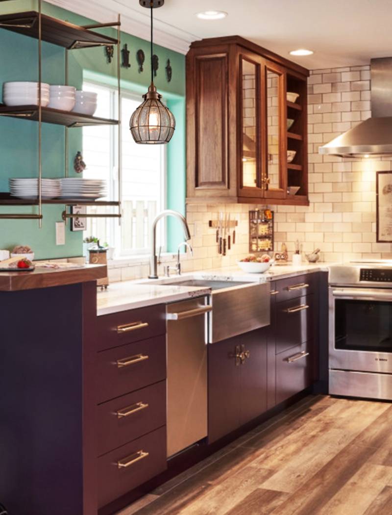 The glass globe pendant lights’ canopies, wire cages, and lamp holders boast an antique red copper finish, sending out a rustic charm to the kitchen. The cracked glass globe shade of these pendant lights is opaque and dreamy and gives off a gentle glow to the space, creating a warm ambiance in the space. Each glass shade of the pendant lights is protected by a wire cage, which delivers a farmhouse appeal and offers signature elements to the small kitchen. An amazing glow gently filters through the opaque cracked glass shades, creating intriguing light effects and shades. The cabinets repeat the light fixtures’ red copper finish to create harmony in the space. The green walls and the glass globe pendant lights serve as statement pieces for gracing the kitchen. They are perfect additions to modern interiors, as their rounded profile softens the clean lines of these spaces and adds a bit of coziness.