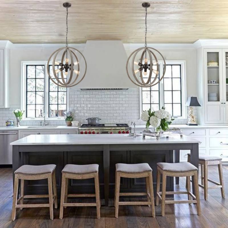 The large globe pendant light fixtures above the kitchen island are fitted with three wooden rings in distressed gray. Their lamp holders, chains, and canopies are showing off a rusty dark brown finish, standing out vividly against the wood rings. A mix of finishes encompasses both nature-inspired qualities and farmhouse elements, yet maintains an industrial feel. Inspired by an ancient armillary sphere, you can get a slightly different look of the large globe pendant light fixtures to go with your overall design scheme simply by adjusting the rings. Their atom-inspired silhouette sports multiple lamp holders sticking out from an orb serving as the epicenter for the light fixture. Their dark brown finish works beautifully with the dining chairs and the tawny wood floor.