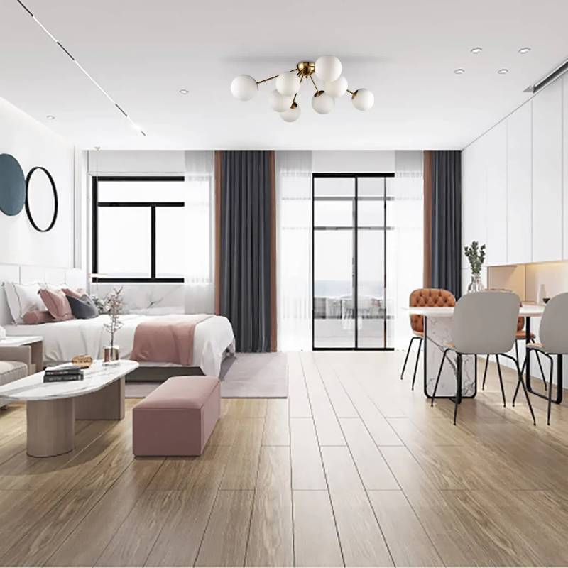 Being dressed in an electroplated brass finish, the 8-light Sputnik semi-flush mount ceiling light energizes the bedroom with a touch of brightness. Crafted from impurity-free hand-blown opaque opal glass, its glass shades of varying sizes offer a sleek sphere silhouette and a touch of geometry. Its Sputnik design boasts downward extending arms holding eight glass shades and suspending the fixture from a semicircular canopy. It provides the perfect blend of mid-century classic and contemporary elements and completes the aesthetic with a refined touch. Its rounded lampshades warm up the cool lines of the bedroom’s modern design. Its shiny brass finish is a great match for the tortilla wood floor and the tufted orange-brown chairs. The light fixture, the pink bench, and the pink bedding give the bedroom a burst of color and provide both function and style to the space.