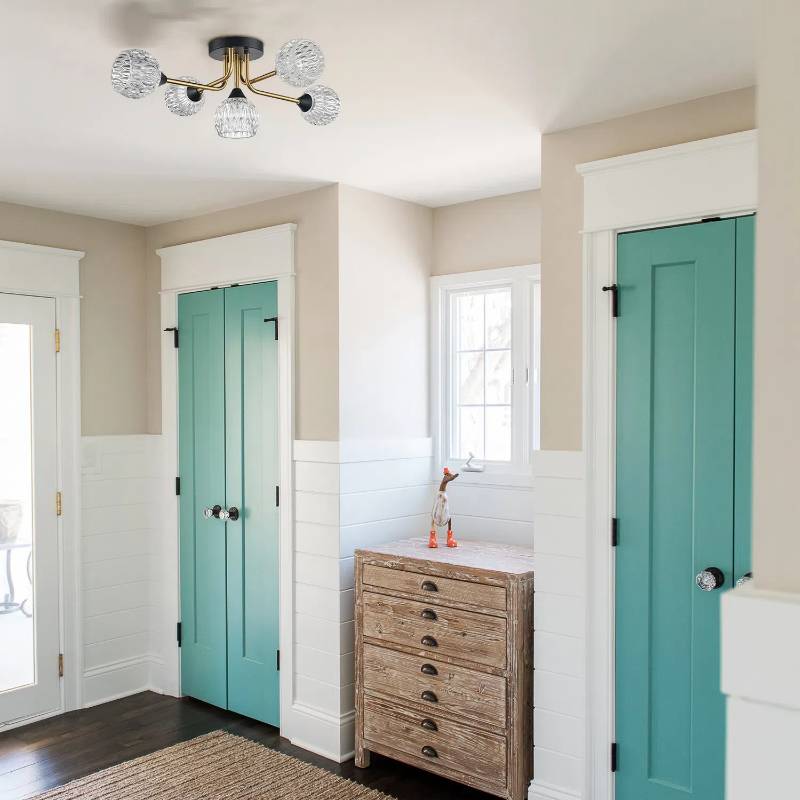 The 5-light Sputnik semi-flush mount ceiling light's five arms are accented with a rustproof gold finish, highlighting the entryway with a bit of bling. Its lamp holders and canopy showcase a black finish to add a dash of drama to the interior. The contrast of black and gold will make sure all eyes of the visitors are on this Sputnik ceiling light the moment they walk in. A mix of finishes encompasses both mid-century modern qualities and classic elements, yet maintains an industrial edge. It flaunts five leave-patterned crystal glass shades that provide attractive eye appeal and stand out and shine on their own. The Sputnik ceiling light also shows off five intersecting curved arms that spread light in all directions and each arm carries a glass shade at the end. The Sputnik-inspired design brings a touch of modern sophistication and a touch of luxury to the entryway. The ceiling light and the green doors add a sense of bold persona to the entryway.