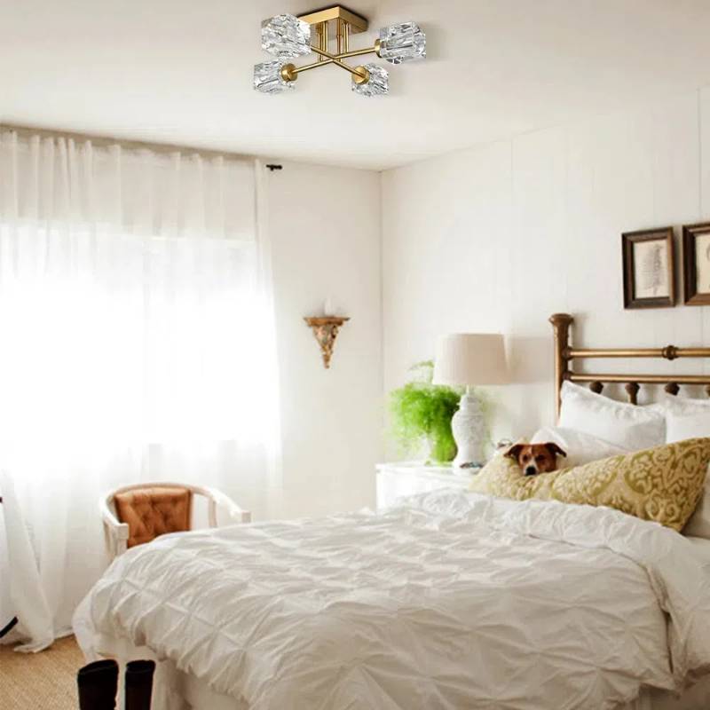 Flaunting a rustproof electrophoretic gold finish, the Sputnik ceiling light fixture delivers a dramatic decorative impact and makes the bedroom fizz with a pop of personality. Its four intersecting arms spread light in all directions and each arm carries a crystal glass shade at the end. The crystal glass shades largely resemble the glittering ice cubes. It contributes so much to the visual impact of the space. A 4-light stunner fills the bedroom with unrivaled style and creates a look that is sure to grab a few glances. With its gold finish standing out against the crystal glass shades, the light fixture is a guaranteed showstopper in the bedroom. The wall light and the headboard of the bed bring out tones from the ceiling light, providing a large dose of glamor to the bedroom. The gold Sputnik ceiling light, the gold wall light, the gold headboard, the white bedding, and the green plants create a calming color scheme and evoke relaxation in the bedroom.