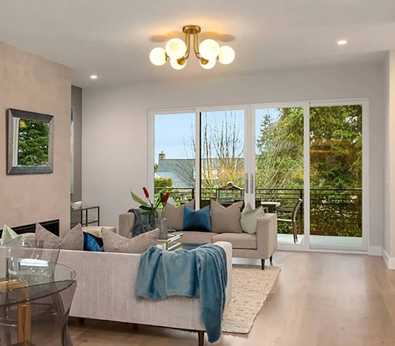 Flaunting an electrophoretic brass finish, the 6-light Sputnik ceiling light fixture’s canopy, arms, and lamp holders show off the unique texture of double-layer electroplating and brushed metal. Crafted from impurity-free hand-blown opaque opal glass, the rounded profile of its lampshades can instantly soften a living room with sharp angles. It is a wow-worthy addition to the living space with its gleaming finish. Six glass shades are supported by gracefully curved arms, conveying a refined touch. The ceiling light’s globe shades can distribute light evenly to avoid shadows. The glistening finish contrasts the white glass globe shade and offers an alluring eye appeal to the living room. The light fixture’s brass finish goes well with the tawny wood floor, the taupe couches, and the taupe area rug. The light fixture and the blue decor create a relaxing atmosphere for chatting or entertaining with friends and relatives.