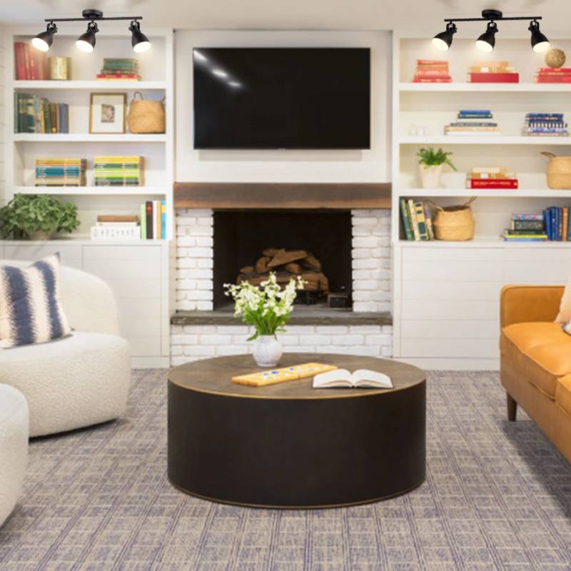 Flaunting a rustproof matte black finish, the black wrought iron track lights bring a dash of vintage vibe to the living room. Three cone shades are attached to a matching canopy for a clean and cohesive look. The cone shades sport an opaque white interior which allows more light to reflect. A mix of finishes encompasses both modern qualities and classic elements, yet maintains an industrial edge. The track light heads can be adjusted to direct light where it is needed most with a 350-degree rotation. They can either be mounted to ceilings or walls. They fill the living room with luminous glamour and add unbeatable character. They shine through the white cabinets. The bright-colored couch, the white sofas, and the tracking lights create a fantastic atmosphere to relax.