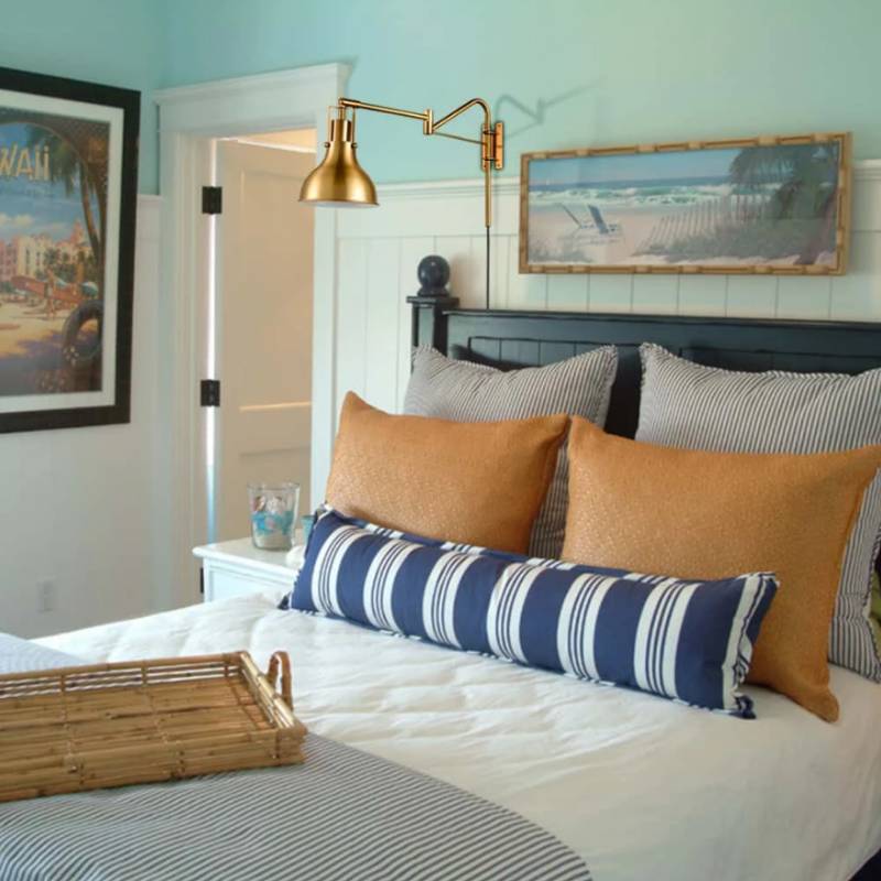 The industrial wrought iron wall sconce’s outer surface of dome shade, swing arm, and canopy infuse a touch of shimmer to this coastal bedroom with an electrophoretic brass finish on the exterior. Its inner surface of the dome shade is dressed in a white finish, which allows more light to reflect. Its beautiful dual finish makes a modern yet classic statement in the living space. The joints attached to the lampshade are adjustable to pivot 350 degrees while the lampshades themselves swivel 90 degrees vertically. You can freely adjust the wall sconce to provide perfect amount of soothing light for your reading or working before bedtime. Its glistening finish establishes a mesmerizing contrast against the light teal walls and the artworks while coordinating with the ochre cushions. The light teal walls and blue-and-white striped bedding enhance the bedroom's coastal appeal.