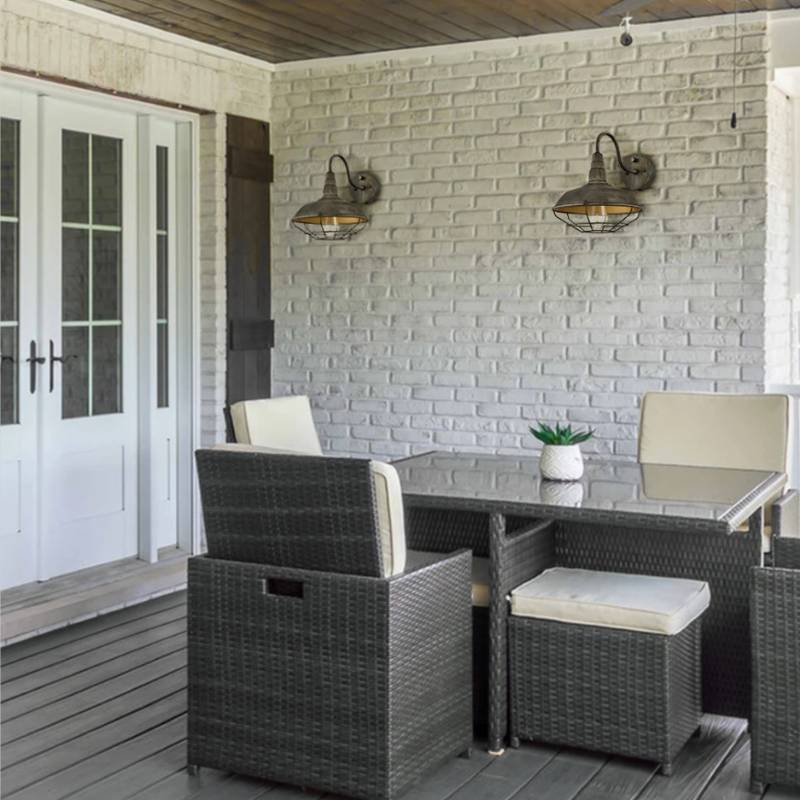 Crafted of solid wrought iron, the wrought iron wall sconces flaunt a dark charcoal gray finish, injecting a farmhouse-inspired charm into the dining room. Its exquisitely welded metal cage and the solid metal dome shade bring an extra dose of industrial style to the room. A charming glow shines through the airy cage, creating intriguing light effects and shades. Wall sconces’ gooseneck design is the classic design of vintage fixtures emitting warm and cozy light rays. They keep the dinning room well-lit, elegant, and make for a welcoming atmosphere perfect for gathering. The dining table, the rattan dining chairs, and the wood floor pull colors from iron wall sconces, showing off a cohesive look throughout the home.