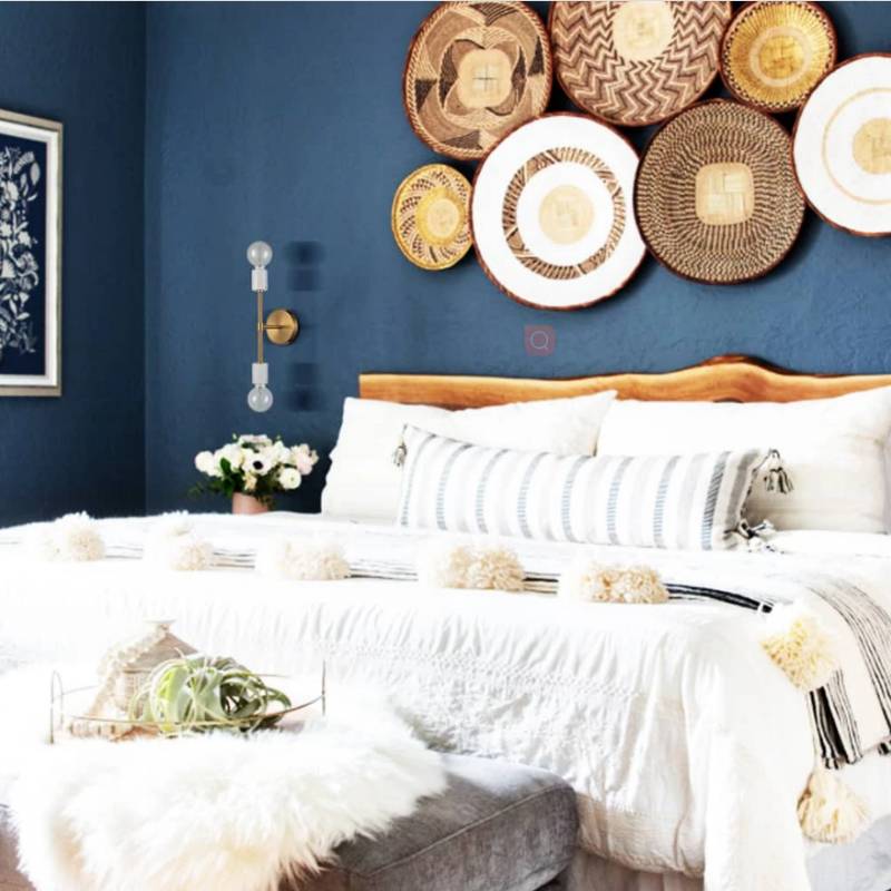 Flaunting an electrophoretic brass finish, the gold iron wall sconce spruces up the bedroom with glitzy sparkle. Its lamp holders showcase the texture of white marble to give the light fixture a stunning decorative detail. It brings a ton of eye appeal to the interior with the double-layer electroplating brass and brushed metal. A mix of finishes encompasses both mid-century modern qualities and classic elements, yet maintains an industrial edge. It can be mounted in a vertical or horizontal orientation to suit your different lighting needs. Featuring dual exposed bulbs on both ends of the arm, it offers the right amount of illumination needed for this modern bedroom. Its shiny finish pairs nicely with wall decors and the headboard while the rounded silhouette of the bulbs and the canopy repeats on the wall decors. The light fixture, the wall decors, the blue walls, and the artwork take a simple space to the next level. The fluffy cushion, the pillows, and the bedding add layering of texture and create a space that is deeply relaxing and inviting.