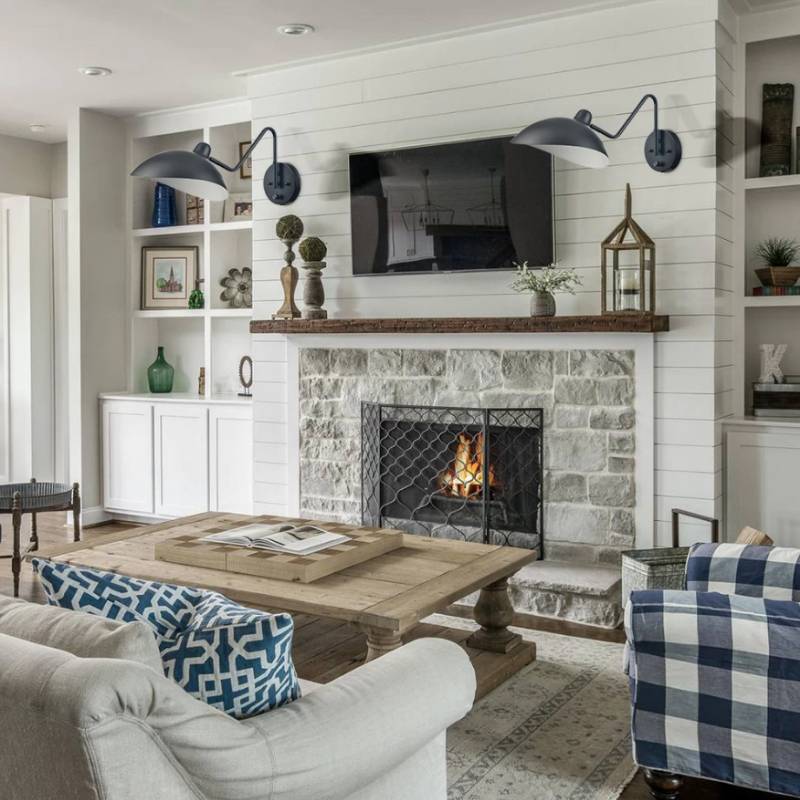 The black wrought iron wall sconces' outer surface of dome shades, swing arms, and canopies give the living room a touch of urban sophistication with a black finish. The inner surface of the dome shades is dressed in a white finish, which helps reflect the light. Their beautiful dual finish makes a modern yet classic statement in the room. They boast a timeless gooseneck design and the gooseneck swing arms are adjustable to pivot 180 degrees horizontally. Their lampshades can swivel 180 degrees vertically and rotate 350 degrees. They allow you to point the light exactly where you need it. They can be used to provide both function and style and bring the splendor and pizzazz to the interior. The black wrought iron wall sconces contrast the white fireplace and add a decorative element. The wall lights, the blue-and-white plaid sofa, and the navy blue patterned cushion save the interior from being boring.