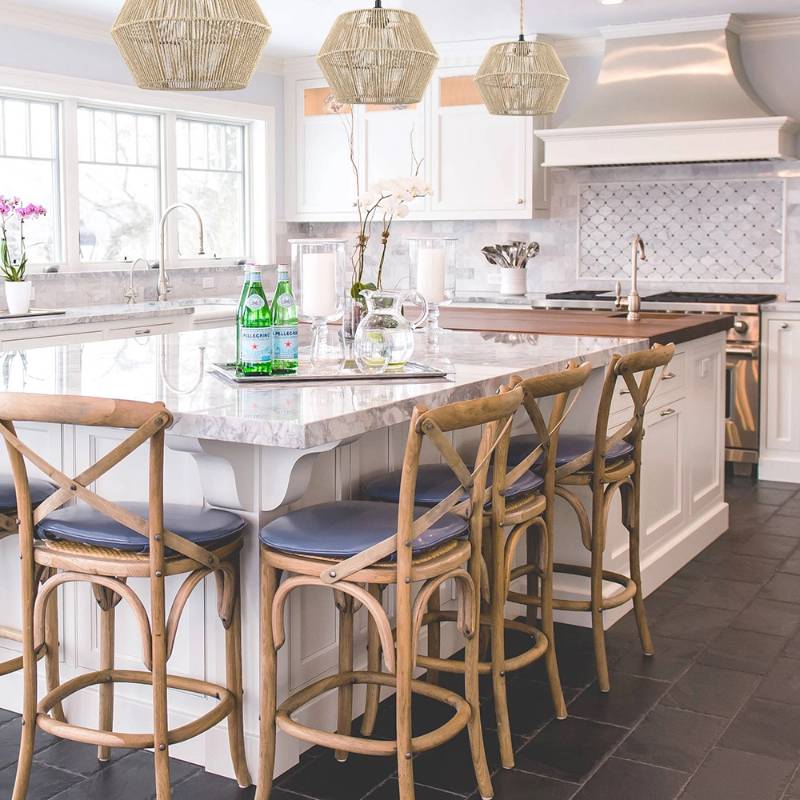 Expertly crafted with paper strings, a trio of farmhouse plug-in pendant lights hanging above the dining area help the kitchen achieve an organic aesthetic. Featuring a sepia finish, their woven rhombus shades add a touch of geometry to the kitchen. It encircles an exposed bulb in the middle, rounding out the design with a large dose of texture. Their lamp holders, plugs, and switches give the space a touch of urban sophistication with a black finish. The sepia paper string cages contrast the black finish and offer alluring eye appeal to the space. Their sepia cages go well with the tortilla wooden stools and the gingerbread brown countertop. The flowers, the wooden stools, and the plug-in pendants add a natural touch to the kitchen.