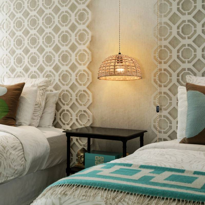 Expertly crafted with rattan, the plug-in pendant lamp lends an organic aesthetic to the bedroom. Featuring an off-white finish, its woven rattan dome shade provides a ton of eye appeal to the bedroom. The lamp holder and the dimmer switch flaunt a black finish. A mix of finishes encompasses both boho-inspired style and rustic elegance, yet maintains an industrial vibe. Featuring fine workmanship, it sports woven crisscross details on the rattan lampshade, serving as a refreshing sight to the scene. A charming glow shines through the airy shade, creating intriguing light effects and shades. It encircles an exposed bulb in the middle for a refined touch. Its off-white cage contrasts just enough with green-and-white throw and the green-and-brown cushions while also injecting some warmth into the space.