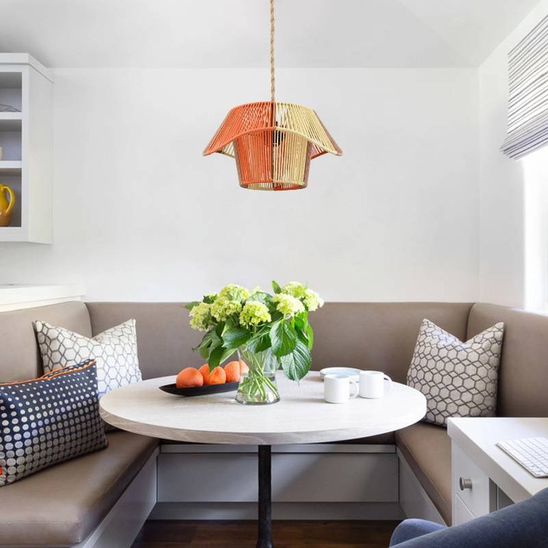 Expertly crafted with paper ropes, the plug-in pendant lamp exudes a warm and organic appeal that instantly brings a sense of harmony and comfort to the living room. Featuring a multi-colored finish of brown, orange, and beige, its airy drum shade brings a touch of geometry and a snappy look to the space. The open lampshade encircles an exposed bulb in the middle, giving the space a glamorous, refreshing vibe. Its airy drum shade is protected by an outer airy cone cage, showing off a perfect blend of artistry and functionality. Featuring fine workmanship, it sports hand-woven details on the paper rope lamp body, helping this room achieve an organic texture. The vibrant colors of the light fixture and the flowers bring zest to the interior and incorporate some color into an otherwise neutral room.