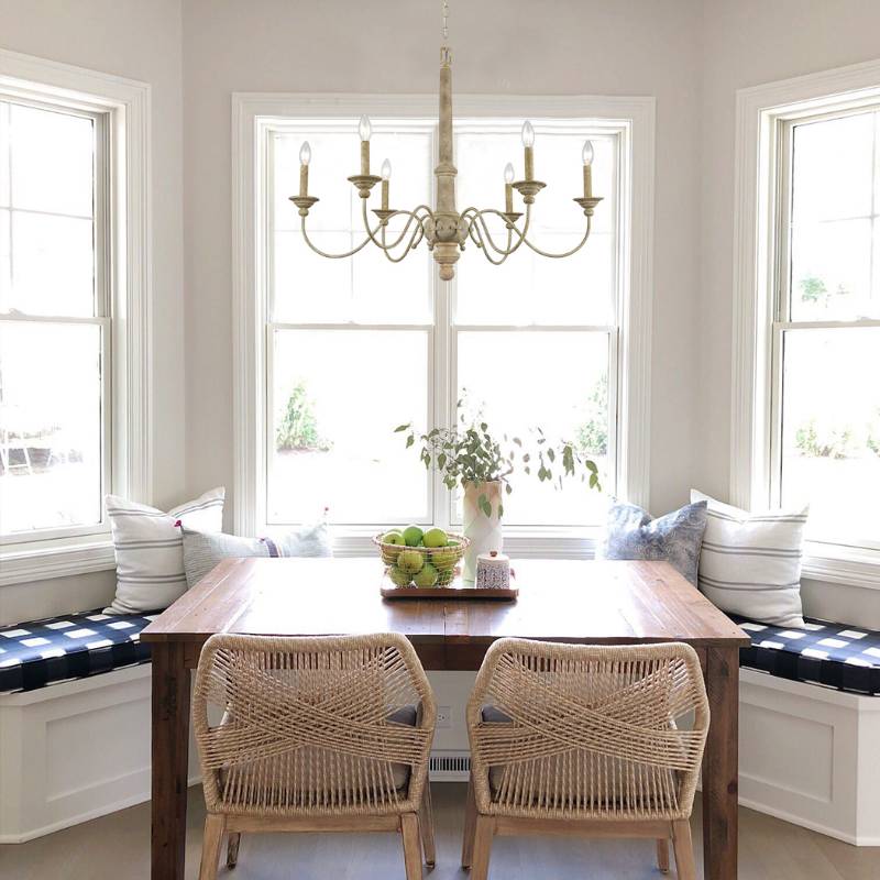 The rustic large chandelier showcases a shabby-chic style with its distressed beige finish. Its wooden frame and candelabra-inspired sockets introduce a dash of old-time elements and a thick sense of history to the living room. The bobeches and candelabra-inspired sockets are supported by elegantly arched arms. The bobeches and the column offer sculpted details and stunning decorative detail. Its distressed beige finish contrasts the white wall, the white window, and the white cushions, adding depth and cleanliness. The light fixture serves as a perfect fit to the caramel hue of the wood floor and the table and the tortilla rattan chairs. It helps this room achieve an organic aesthetic together with the green plant, the wooden table, the wooden floor, and the rattan chairs.